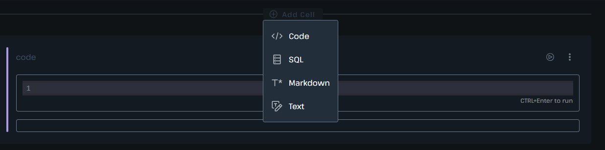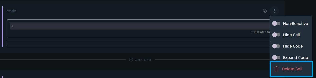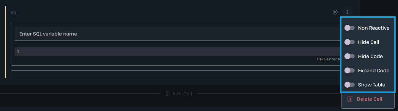 This is the only toggle that applies in both notebook and app mode. Marking a cell as non-reactive means that if you trigger a notebook run from a cell above and this cell is a child cell of any cell that is ran by that trigger, this cell will not be executed. This is useful for not triggering expensive queries or other operations when you don’t need them to be run but should be used with caution as it can lead to unexpected state as you continue to develop your notebook.